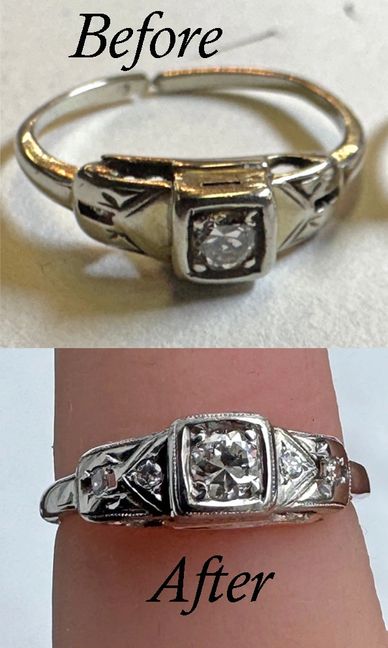 Henry purchased a vintage ring for Hannah at the Antiques Marketplace. Hannah loved the ring but wasn’t thrilled about the white diamond in the center and preferred a blue stone. The Antiques Marketplace recommended they visit my shop to discuss options. Hannah fell in love with the blue diamonds I showed her. She picked out a “dusky blue” color and Henry surprised her by having me add little diamonds in each of the hearts that adorn the band. New prongs and a high polish and the ring looks new!