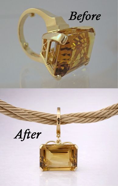Pam had a beautifully cut topaz ring that she rarely wore because of its bold scale. She asked if it could be transformed into a pendant while preserving the original setting. I reimagined the piece by adding a handcrafted side bail enhancer for added dimension and interest, along with a hinged bail at the top for versatility and ease of wear. Finished on a rich gold rope chain, the result is an elegant, wearable statement piece that honors the original design in a fresh new way.