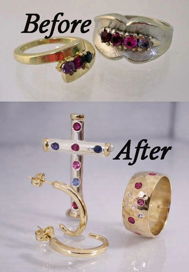 Together, we transformed the gemstones onto a custom hand made sterling silver cross, thoughtfully designed to incorporate each stone from the original rings. The yellow gold ring was melted down and used for accents on the cross and also crafted into a new pair of earrings, giving fresh life to the cherished metal. And, just because every redesign deserves a little joy, an additional hammered band was crafted and accented with rubies and diamonds "just because".