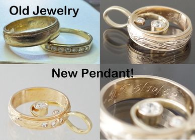Heidi had two wedding rings belonging to family members. She contacted me with ideas of creating a circle pendant using the two rings and incorporating the diamonds and hand engraving. The larger ring contained an engraved message from 1952 that she wanted preserved. The result is a beautiful circle pendant with an added large diamond in the center just because!